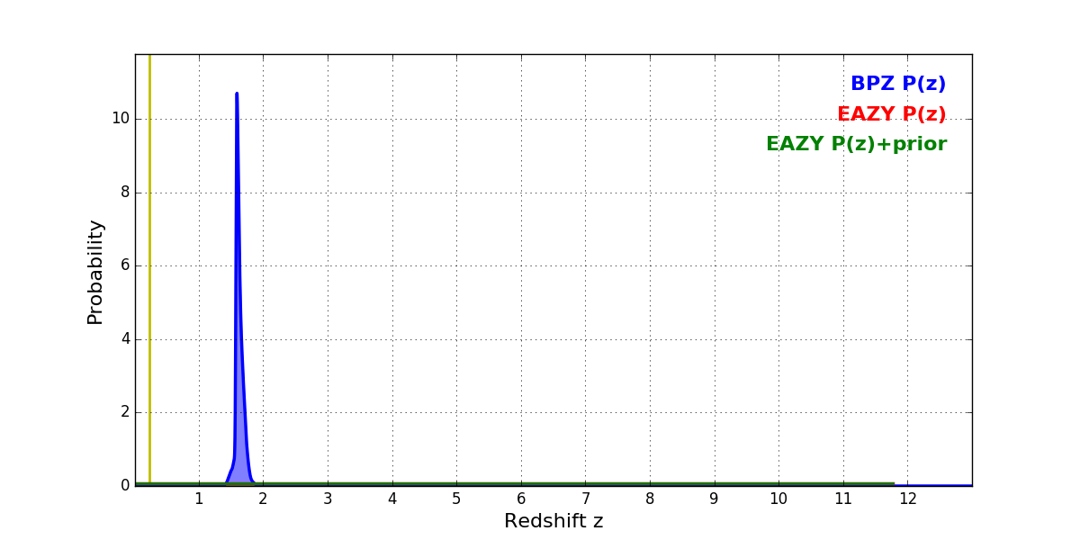 In P(z) plots: Yellow lines mark the cluster redshift z = 0.228,