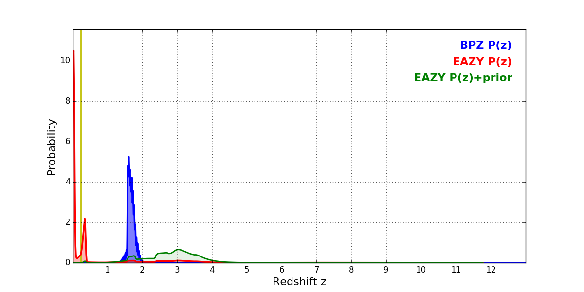 In P(z) plots: Yellow lines mark the cluster redshift z = 0.228,