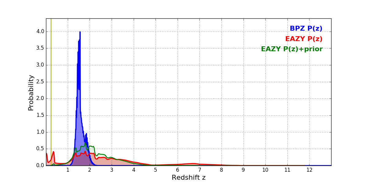 In P(z) plots: Yellow lines mark the cluster redshift z = 0.228,