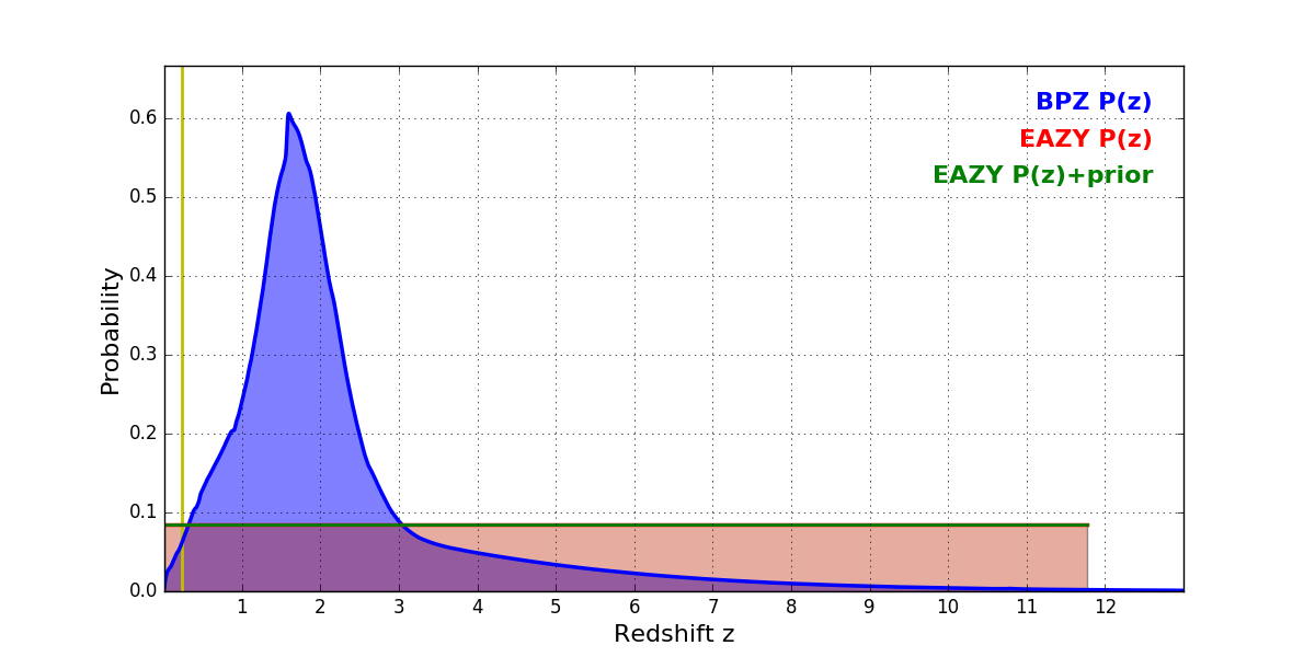 In P(z) plots: Yellow lines mark the cluster redshift z = 0.228,