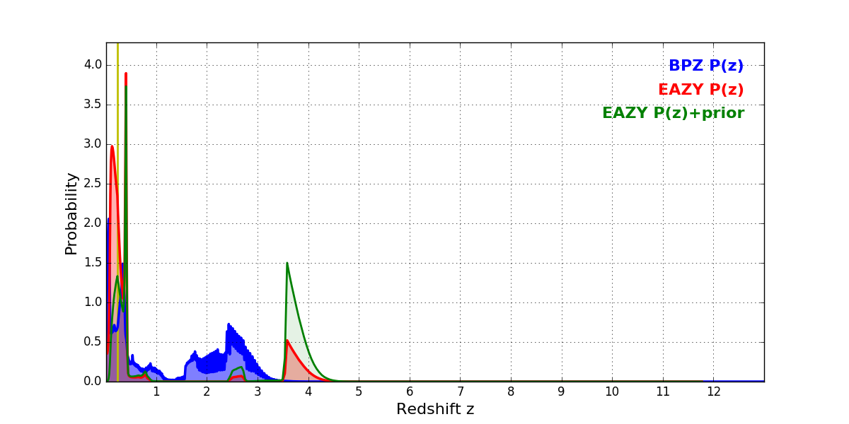 In P(z) plots: Yellow lines mark the cluster redshift z = 0.228,