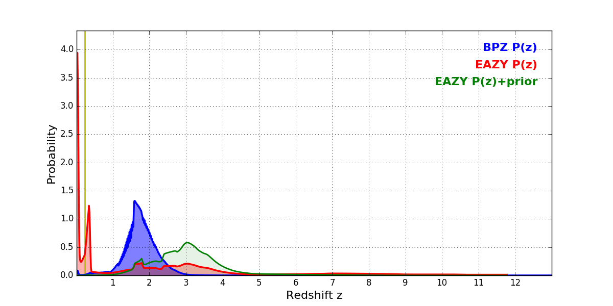 In P(z) plots: Yellow lines mark the cluster redshift z = 0.228,