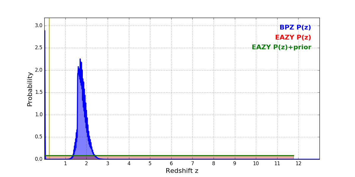 In P(z) plots: Yellow lines mark the cluster redshift z = 0.228,