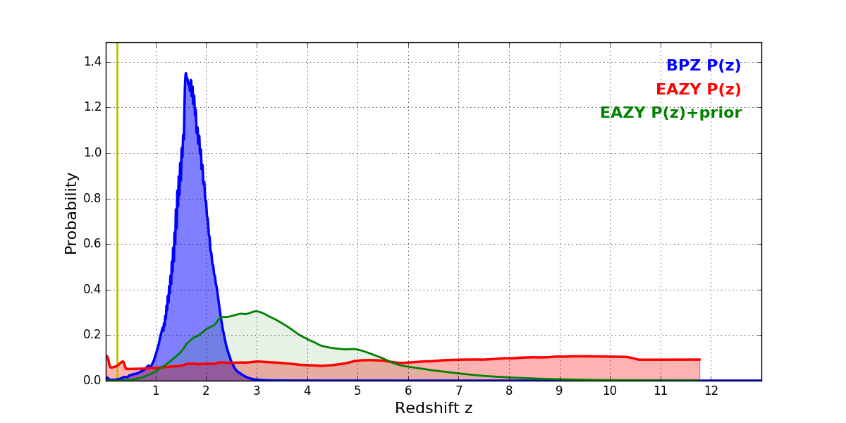 In P(z) plots: Yellow lines mark the cluster redshift z = 0.228,