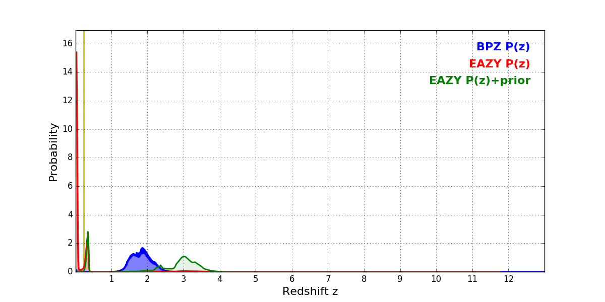 In P(z) plots: Yellow lines mark the cluster redshift z = 0.228,