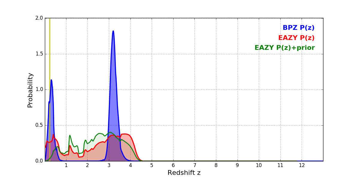 In P(z) plots: Yellow lines mark the cluster redshift z = 0.228,