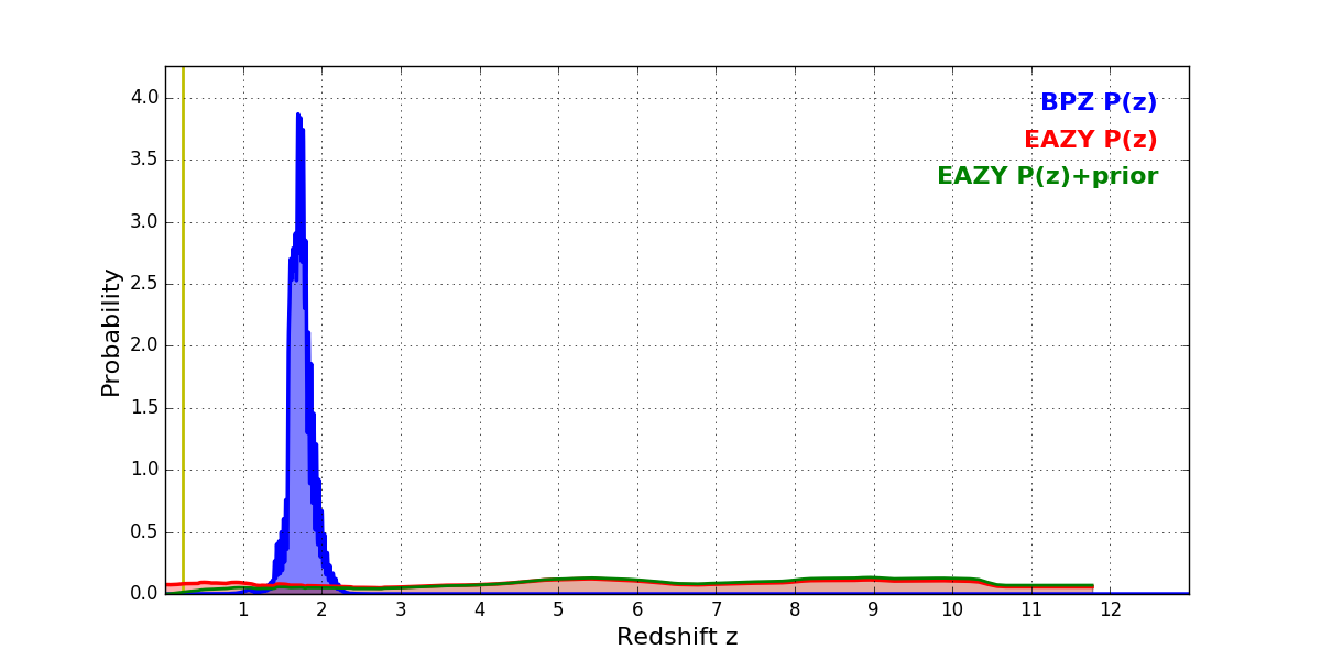In P(z) plots: Yellow lines mark the cluster redshift z = 0.228,