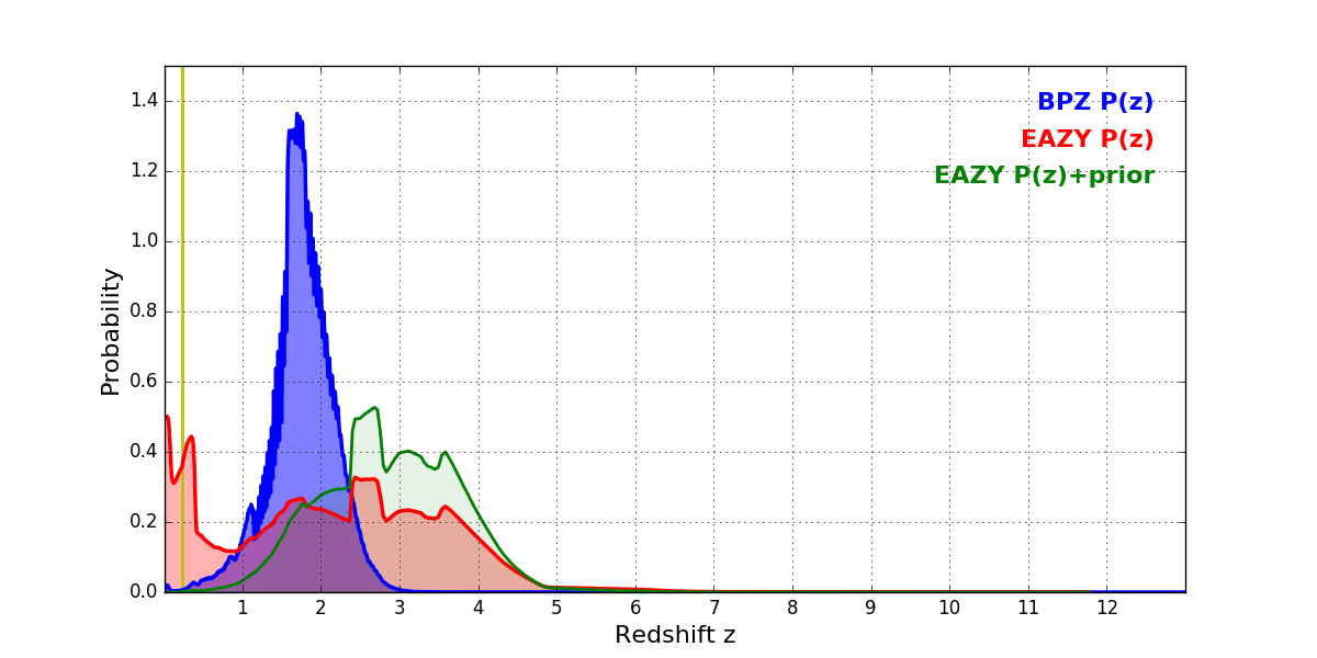In P(z) plots: Yellow lines mark the cluster redshift z = 0.228,
