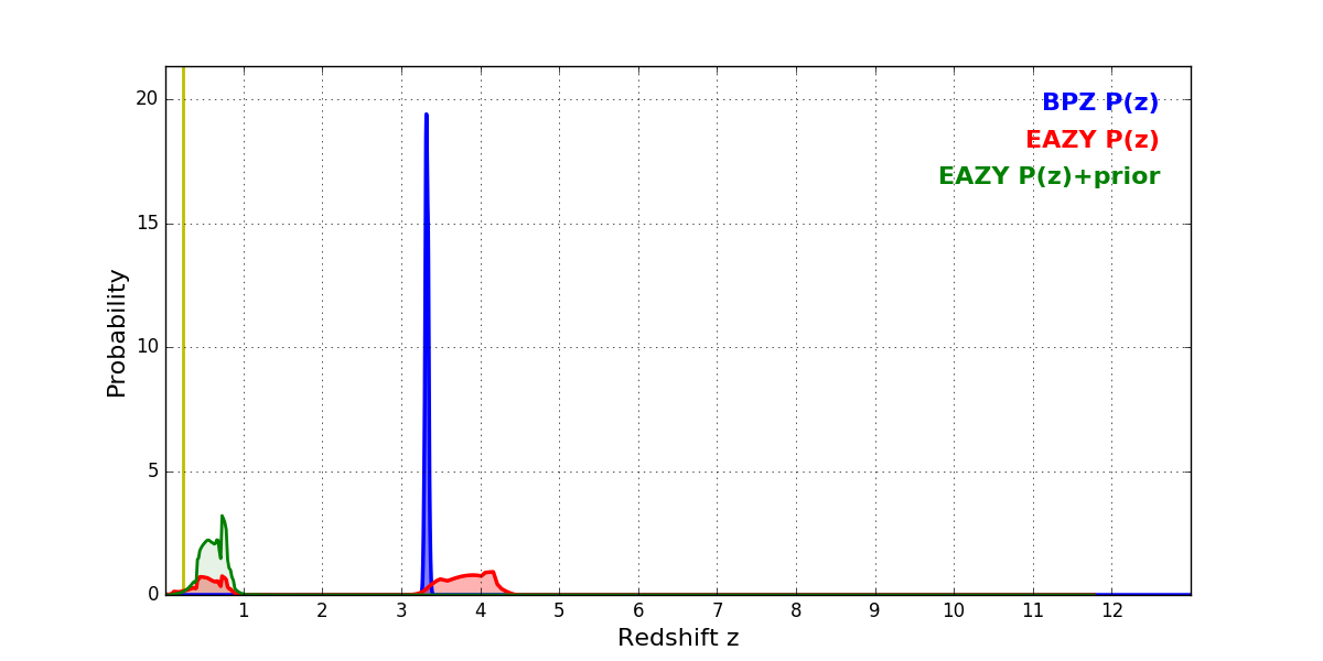 In P(z) plots: Yellow lines mark the cluster redshift z = 0.228,