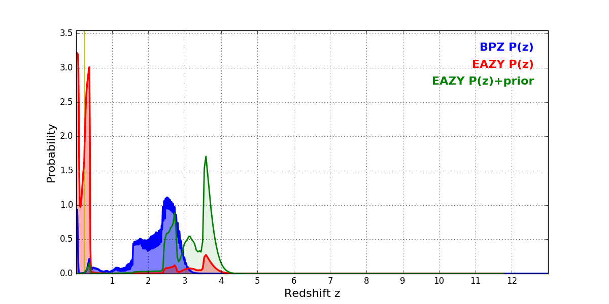 In P(z) plots: Yellow lines mark the cluster redshift z = 0.228,