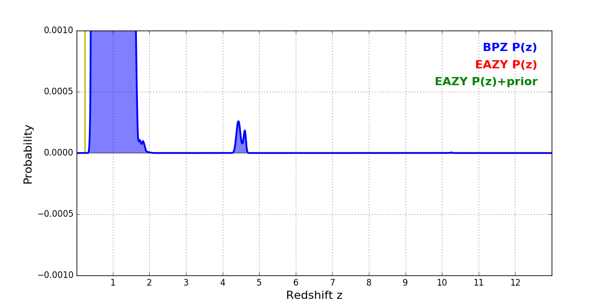 In P(z) plots: Yellow lines mark the cluster redshift z = 0.228,