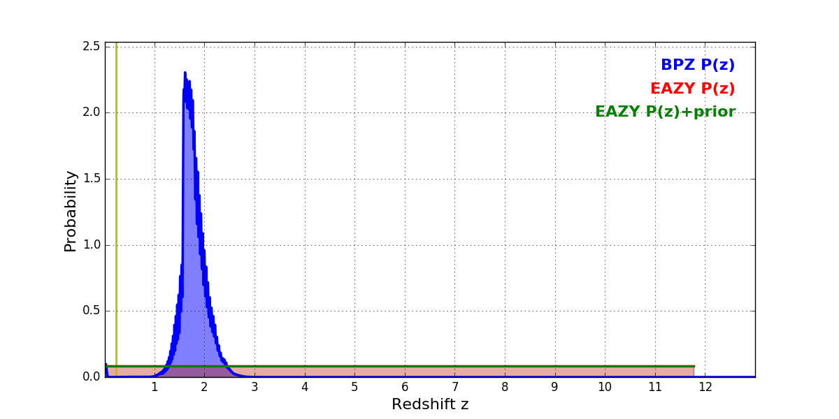 In P(z) plots: Yellow lines mark the cluster redshift z = 0.228,