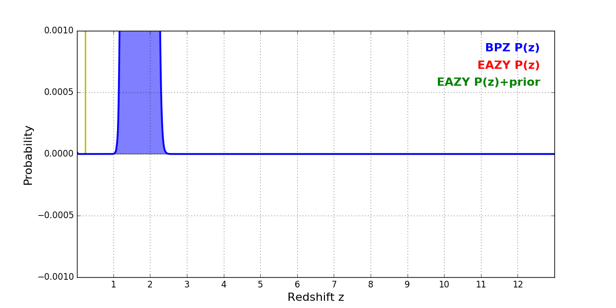 In P(z) plots: Yellow lines mark the cluster redshift z = 0.228,