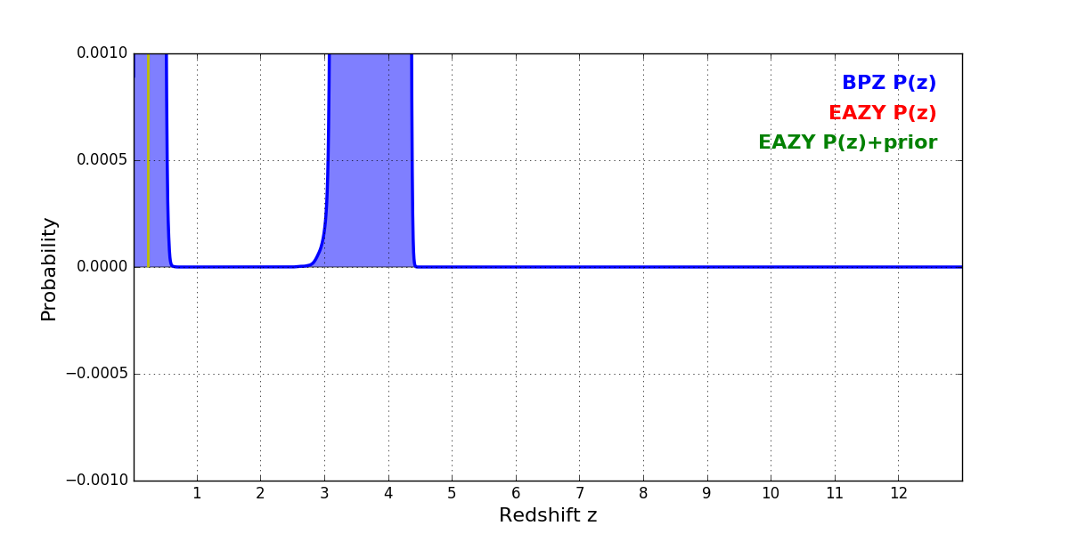 In P(z) plots: Yellow lines mark the cluster redshift z = 0.228,