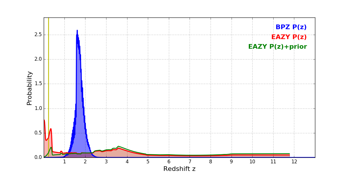 In P(z) plots: Yellow lines mark the cluster redshift z = 0.228,