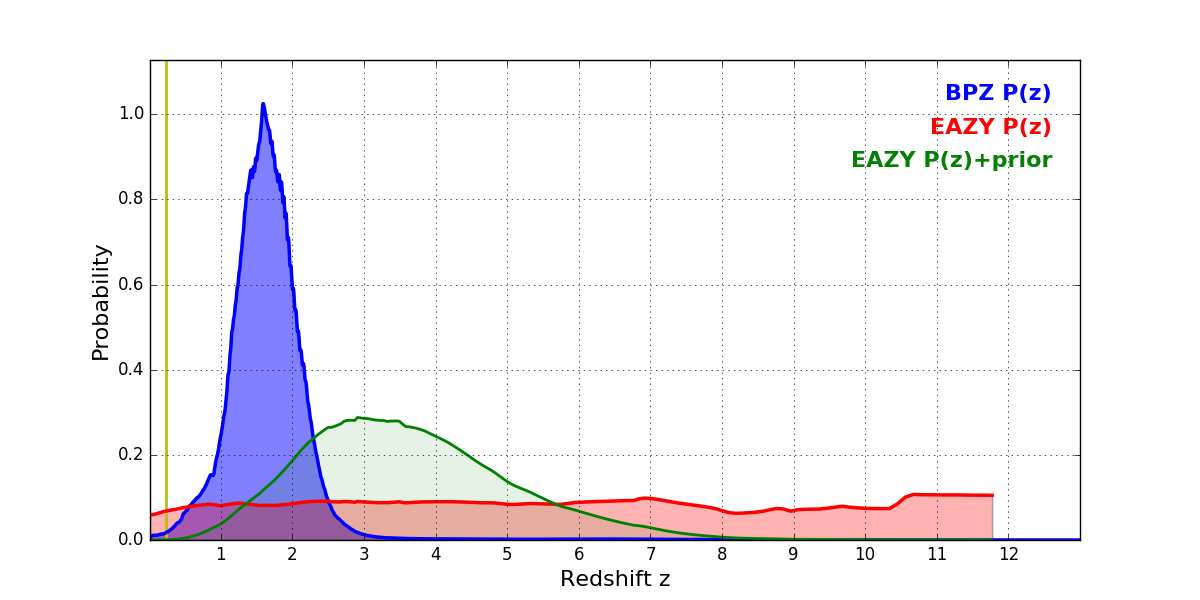 In P(z) plots: Yellow lines mark the cluster redshift z = 0.228,