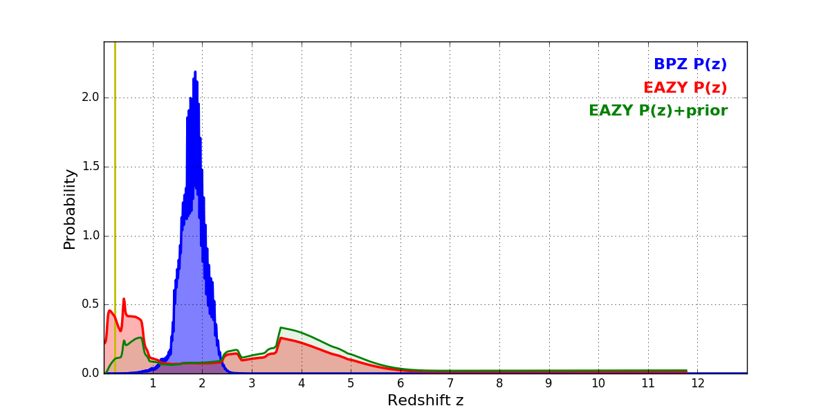 In P(z) plots: Yellow lines mark the cluster redshift z = 0.228,
