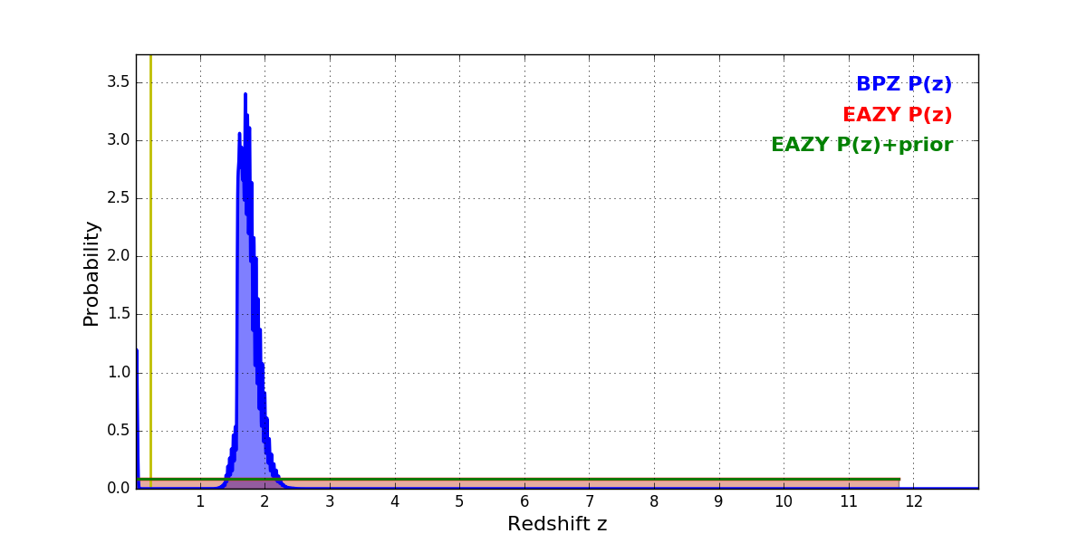 In P(z) plots: Yellow lines mark the cluster redshift z = 0.228,