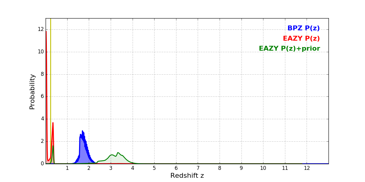 In P(z) plots: Yellow lines mark the cluster redshift z = 0.228,
