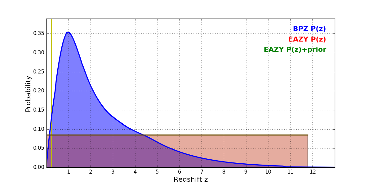 In P(z) plots: Yellow lines mark the cluster redshift z = 0.228,