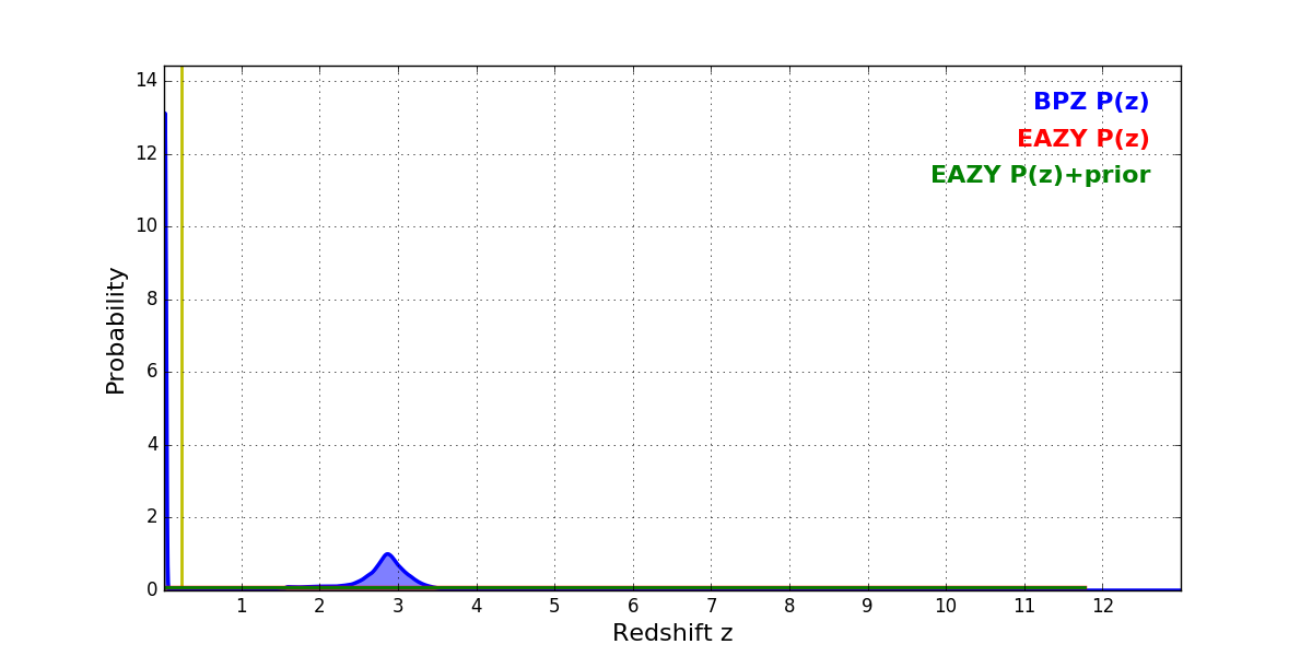 In P(z) plots: Yellow lines mark the cluster redshift z = 0.228,