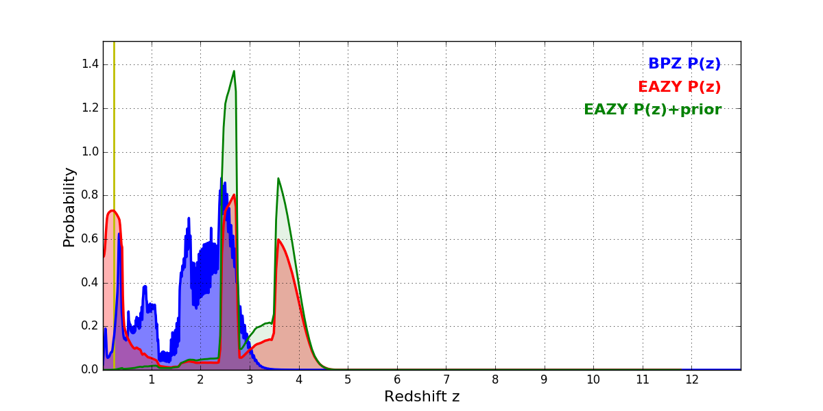 In P(z) plots: Yellow lines mark the cluster redshift z = 0.228,