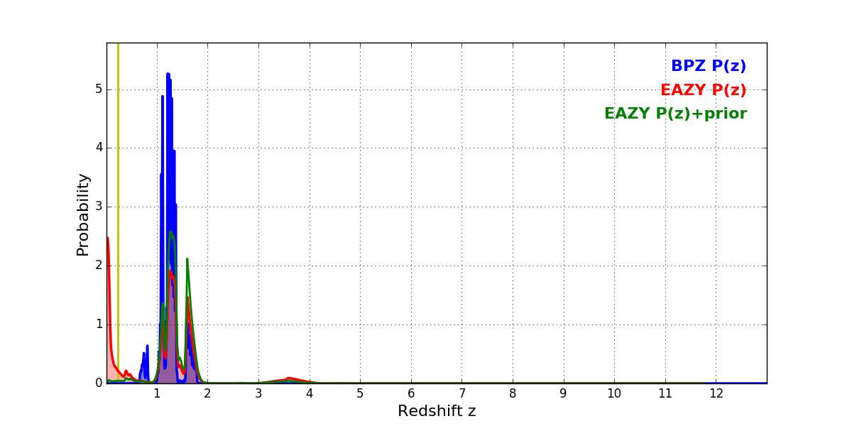 In P(z) plots: Yellow lines mark the cluster redshift z = 0.228,