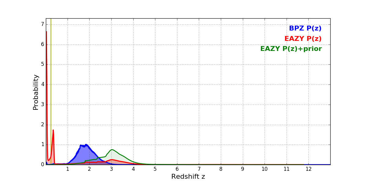 In P(z) plots: Yellow lines mark the cluster redshift z = 0.228,