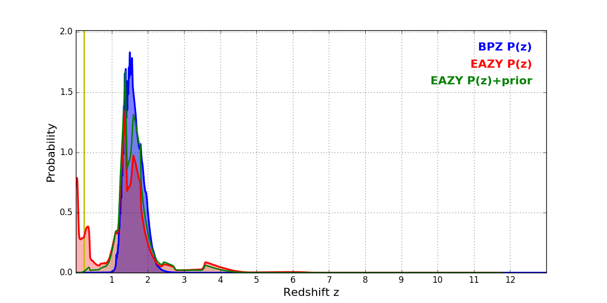 In P(z) plots: Yellow lines mark the cluster redshift z = 0.228,
