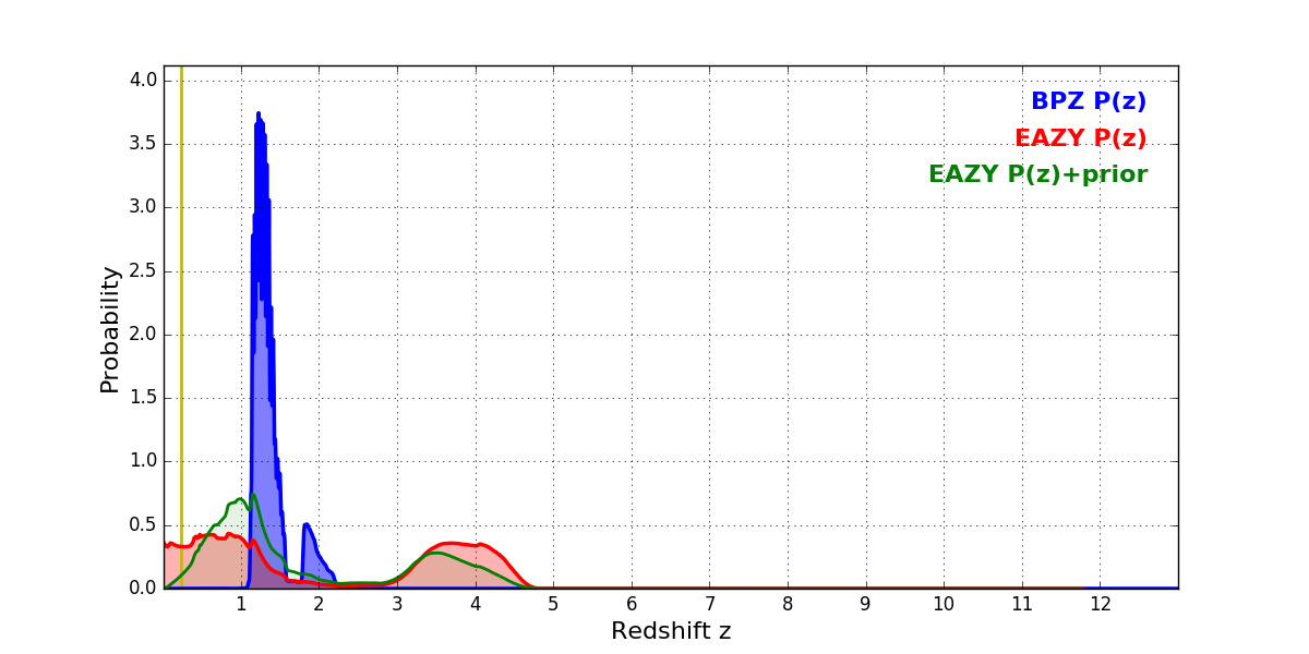 In P(z) plots: Yellow lines mark the cluster redshift z = 0.228,