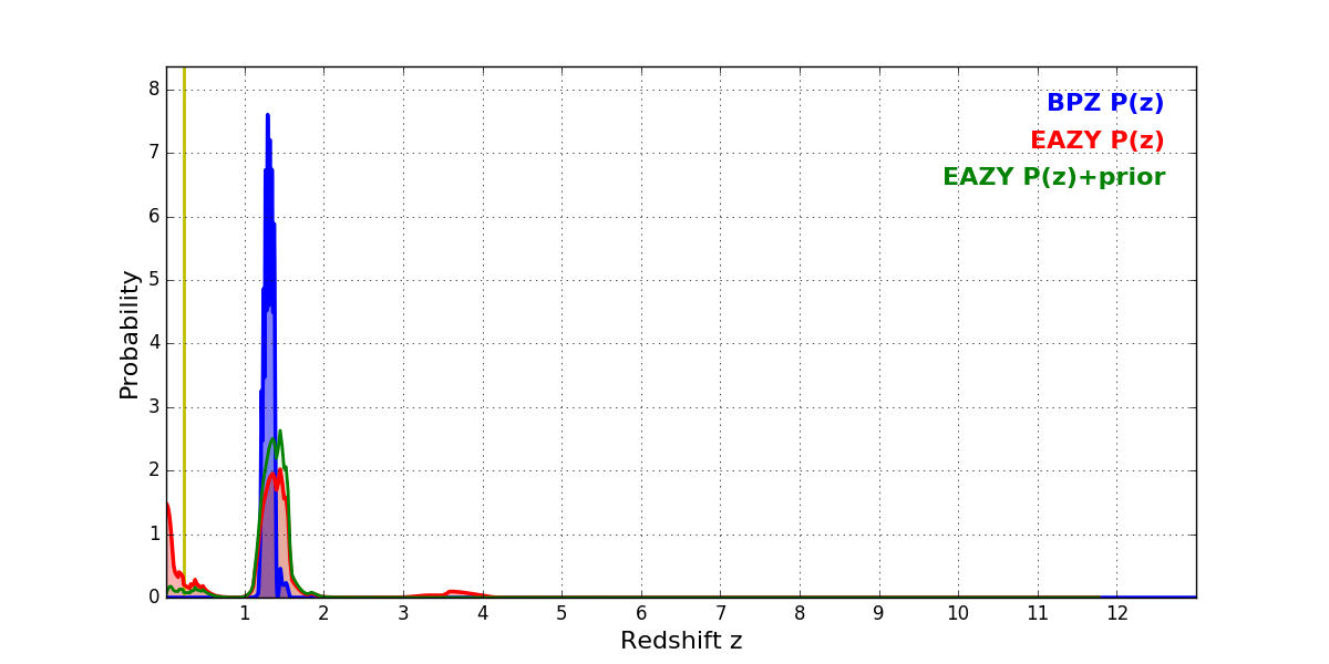 In P(z) plots: Yellow lines mark the cluster redshift z = 0.228,