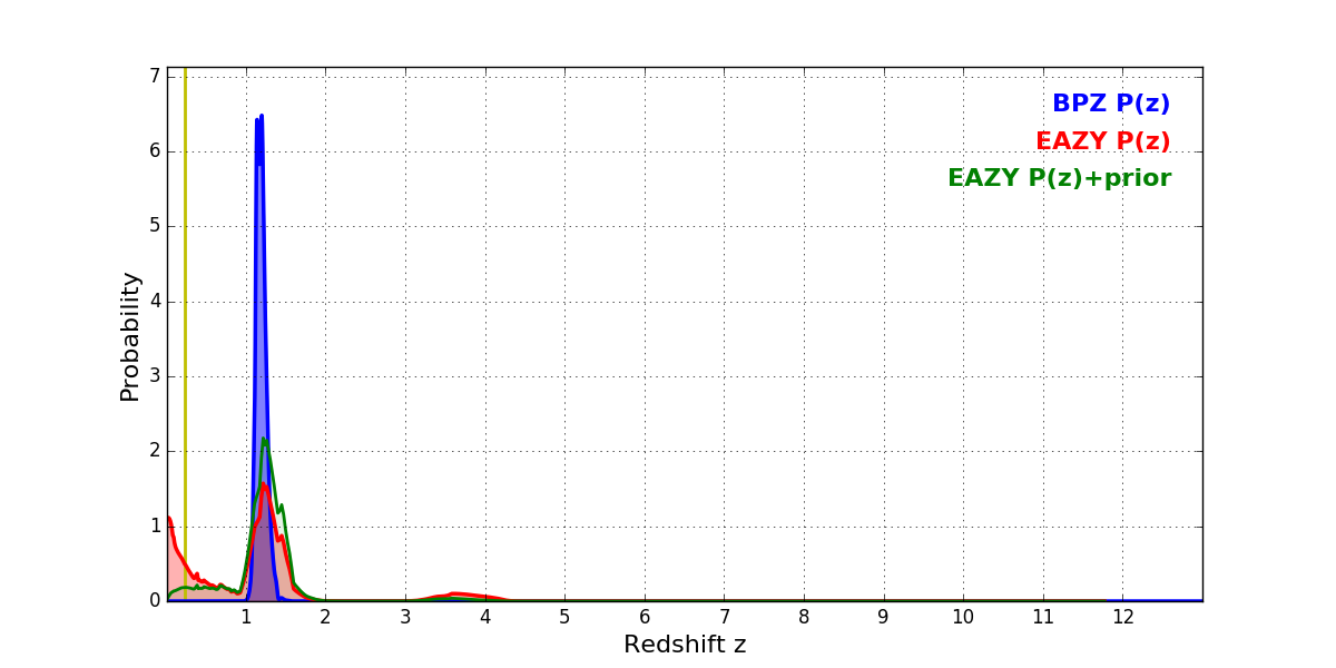 In P(z) plots: Yellow lines mark the cluster redshift z = 0.228,