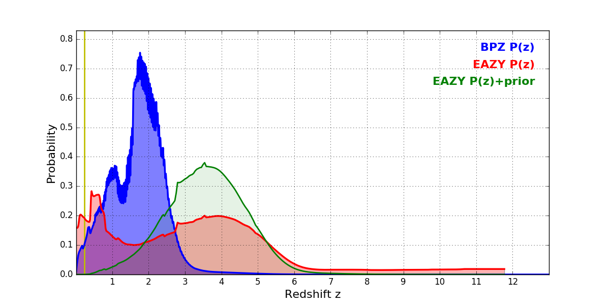 In P(z) plots: Yellow lines mark the cluster redshift z = 0.228,