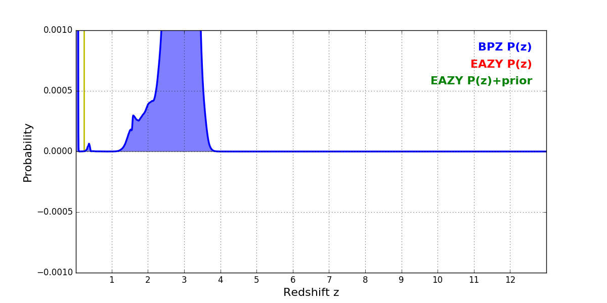 In P(z) plots: Yellow lines mark the cluster redshift z = 0.228,