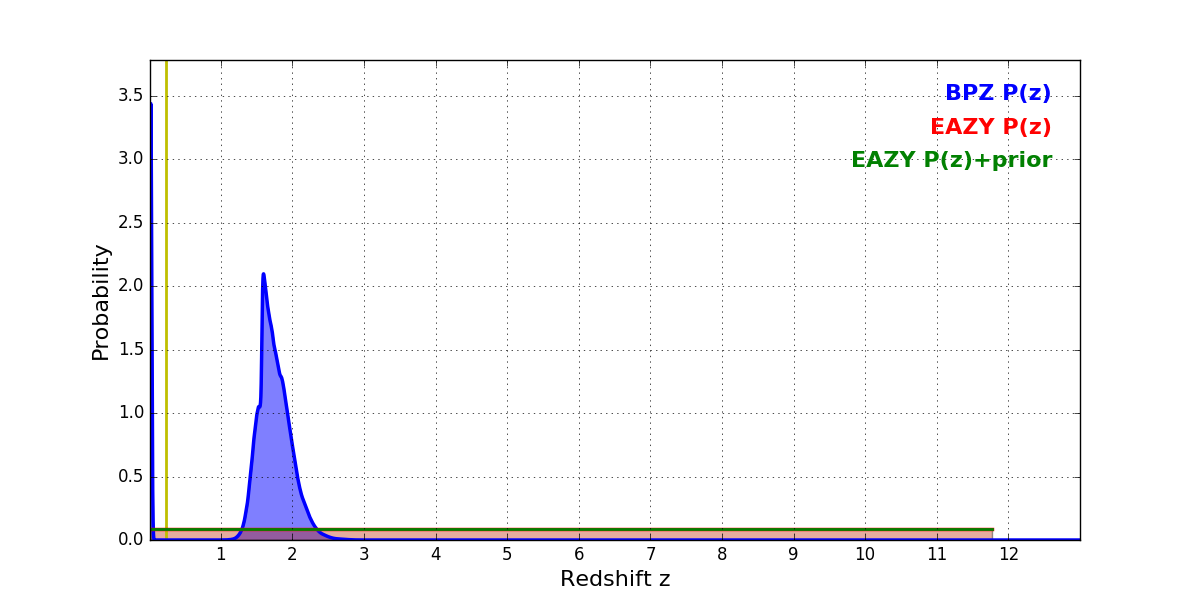 In P(z) plots: Yellow lines mark the cluster redshift z = 0.228,
