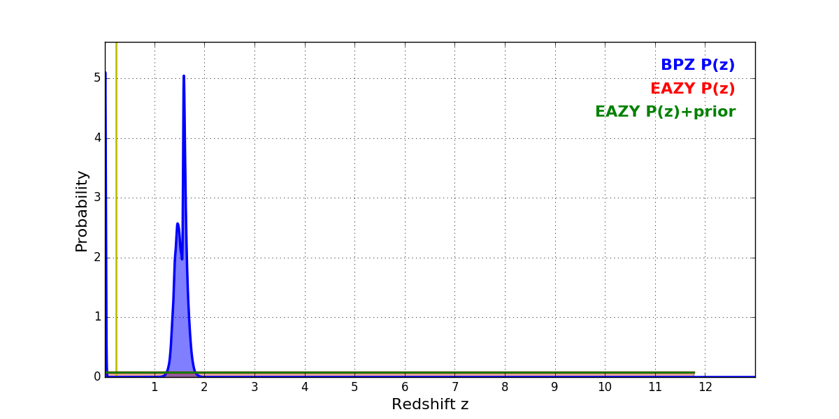 In P(z) plots: Yellow lines mark the cluster redshift z = 0.228,