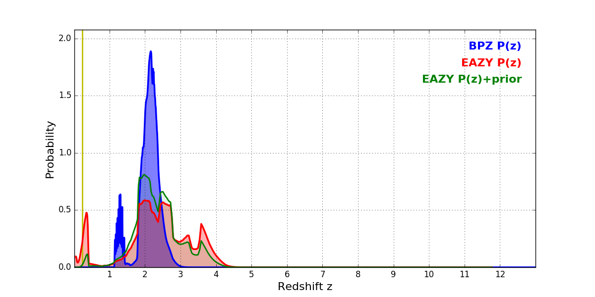 In P(z) plots: Yellow lines mark the cluster redshift z = 0.228,