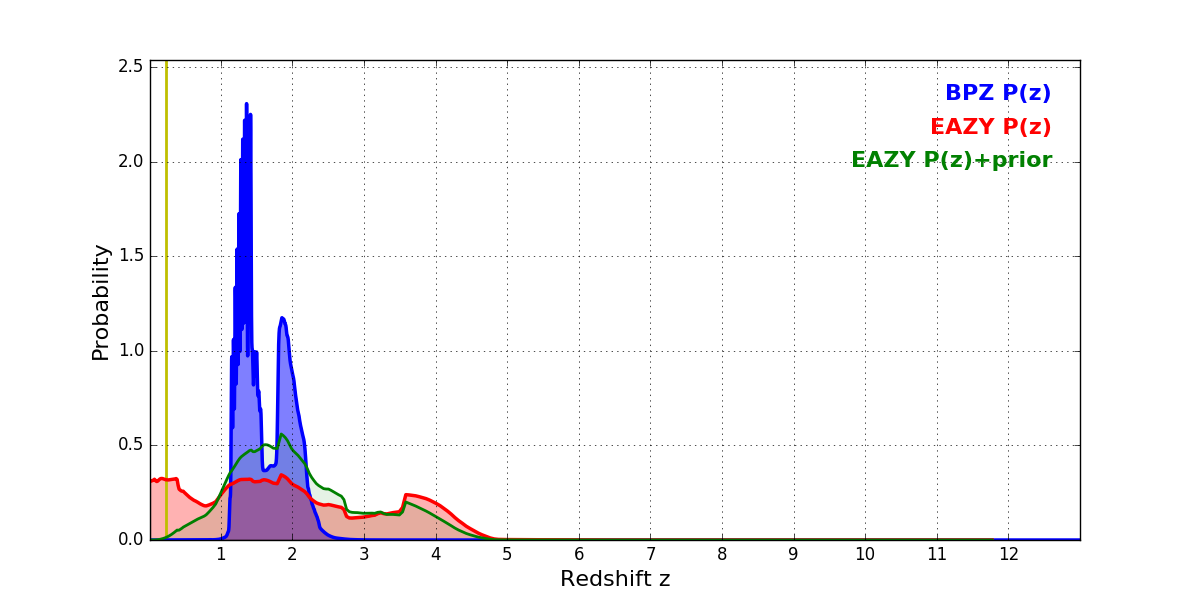 In P(z) plots: Yellow lines mark the cluster redshift z = 0.228,