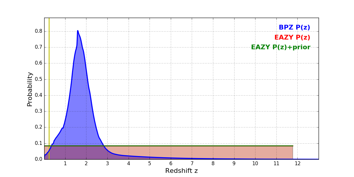 In P(z) plots: Yellow lines mark the cluster redshift z = 0.228,