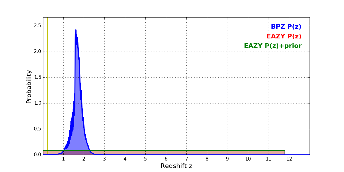 In P(z) plots: Yellow lines mark the cluster redshift z = 0.228,