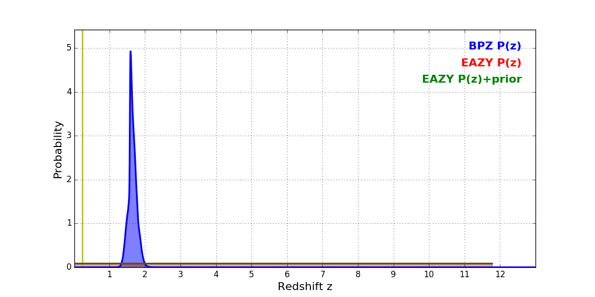 In P(z) plots: Yellow lines mark the cluster redshift z = 0.228,