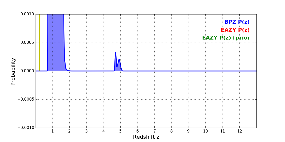 In P(z) plots: Yellow lines mark the cluster redshift z = 0.228,