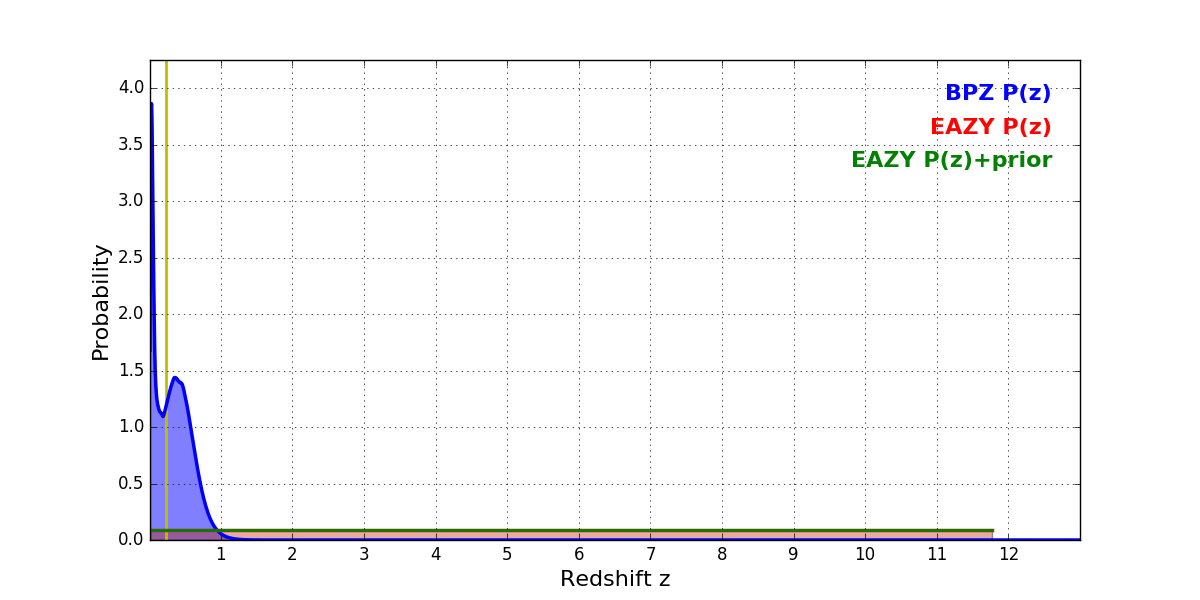 In P(z) plots: Yellow lines mark the cluster redshift z = 0.228,