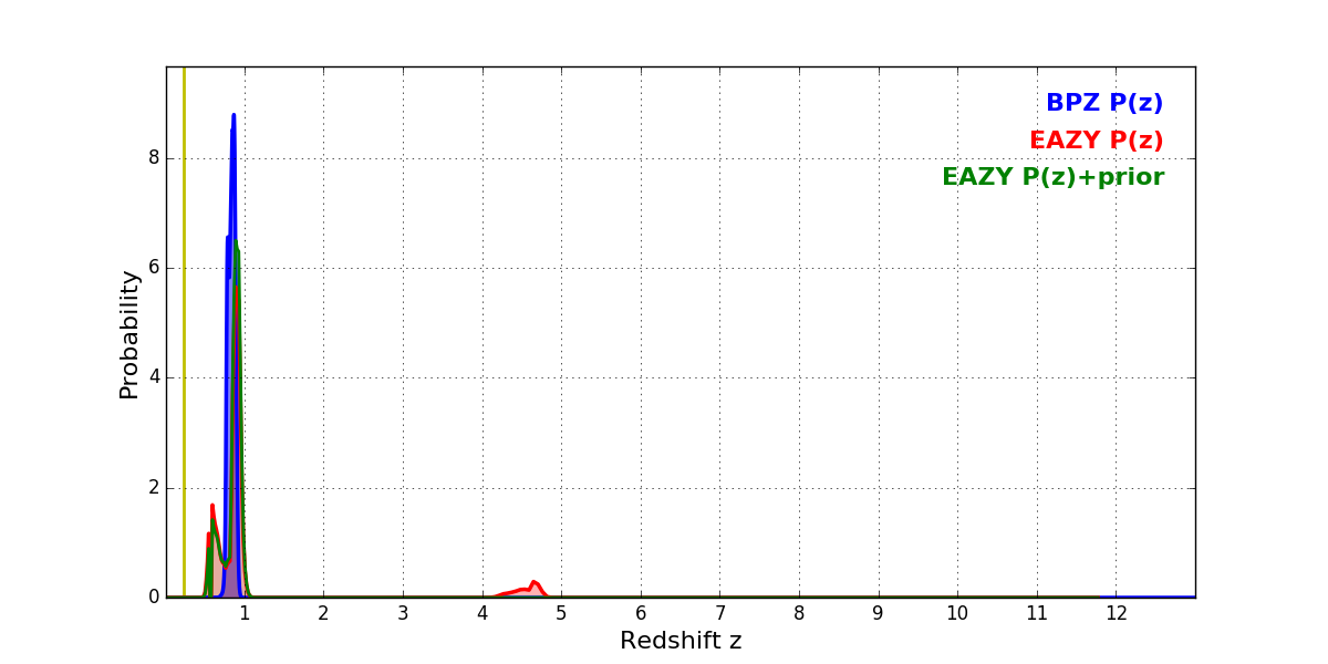 In P(z) plots: Yellow lines mark the cluster redshift z = 0.228,