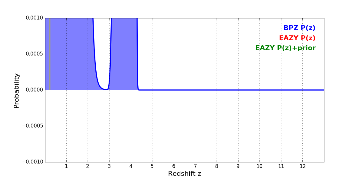 In P(z) plots: Yellow lines mark the cluster redshift z = 0.228,
