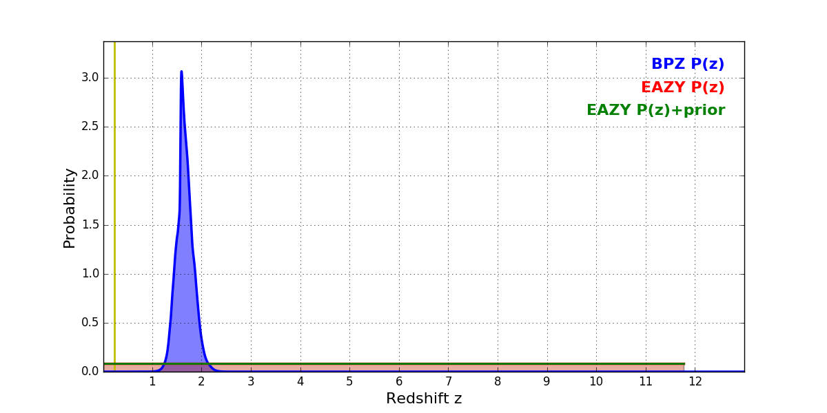 In P(z) plots: Yellow lines mark the cluster redshift z = 0.228,