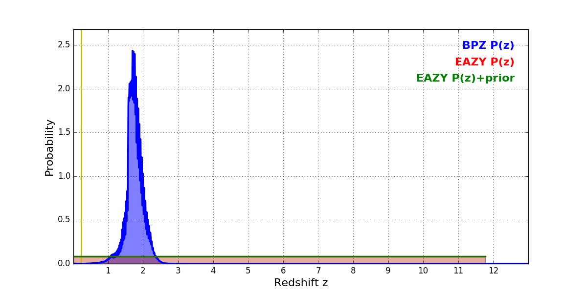 In P(z) plots: Yellow lines mark the cluster redshift z = 0.228,