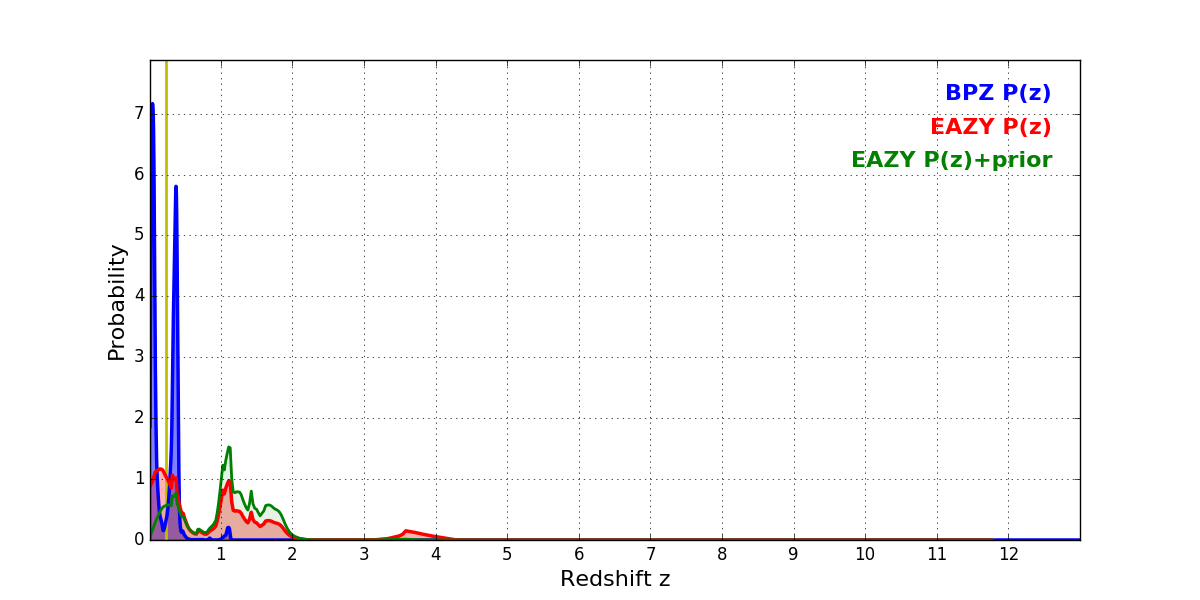 In P(z) plots: Yellow lines mark the cluster redshift z = 0.228,