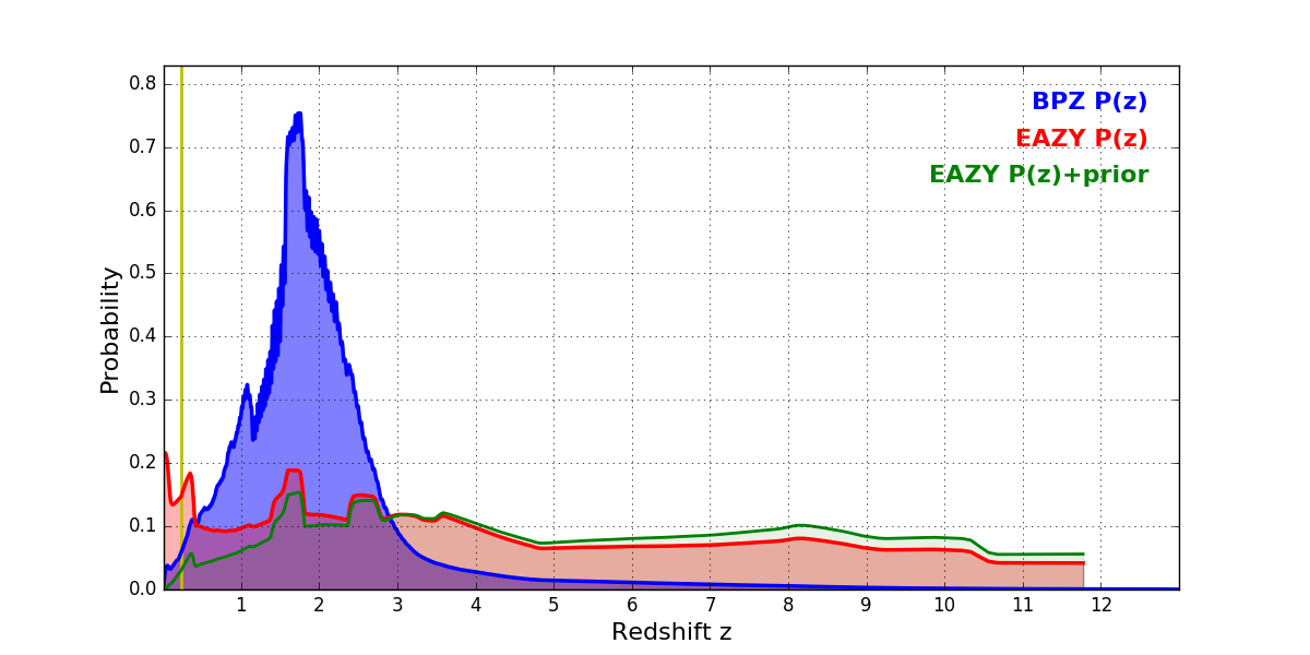 In P(z) plots: Yellow lines mark the cluster redshift z = 0.228,