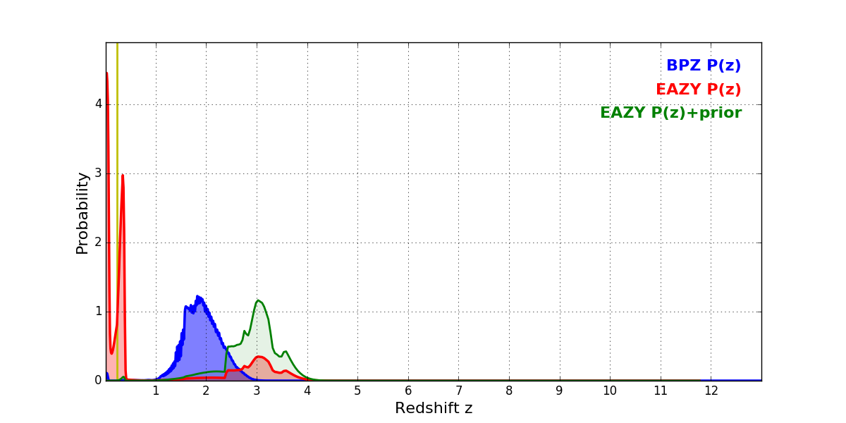 In P(z) plots: Yellow lines mark the cluster redshift z = 0.228,